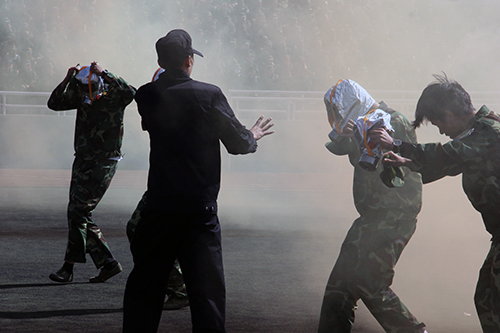 消防战士为演练学生演示灭火器材的使用及逃生方法,参加演练学生开始进行灭火、逃生演练。