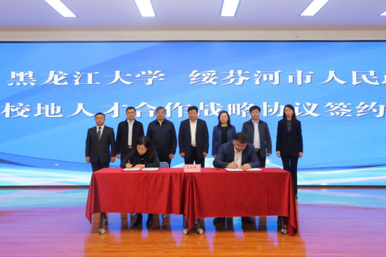 招生就业指导中心主任陈宝凤与绥芬河市委常委、副市长刘庆帅共同签订了《共建人才工作站协议书》和《人才基地建设合作协议》。