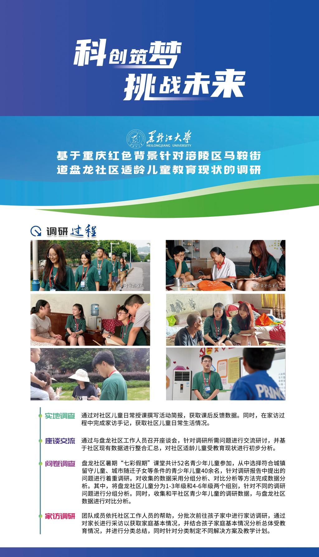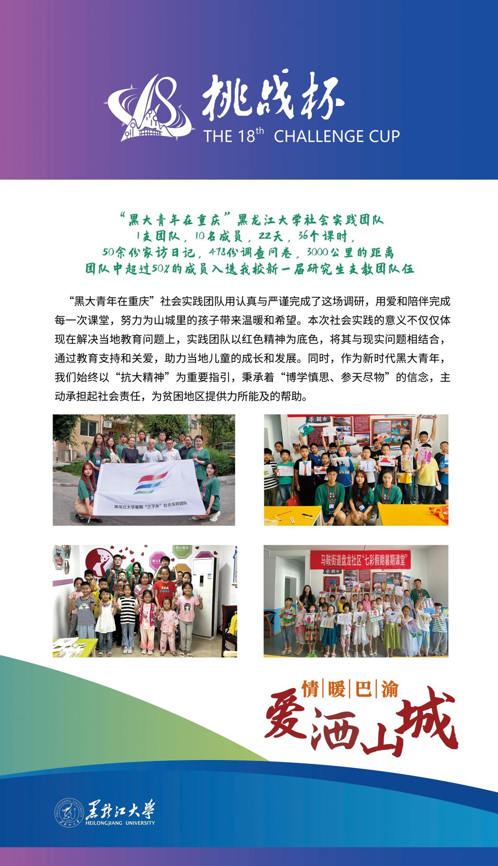 bat365作品《赓续红色基因 助力扶贫扶志——“七彩假期·黑大青年在重庆”bat365官方官网三下乡社会实践团队基于重庆红色背景针对重庆市涪陵区马鞍街道盘龙社区适龄儿童教育现状调研》在终审决赛中取得突破性成绩,在红色专项赛中经过现场答辩,荣获一等奖,这是bat365参加“挑战杯”竞赛以来首次获得国家级一等奖,创造了bat365参加“挑战杯”竞赛的最好成绩,此项目也是黑龙江省本科高校参加“挑战杯”红色专项赛作品中唯一获得一等奖的作品。此外,bat365作品《乡村振兴背景下“新农村”发展路径研究——以查罕诺村和扎龙村为例》获得三等奖。