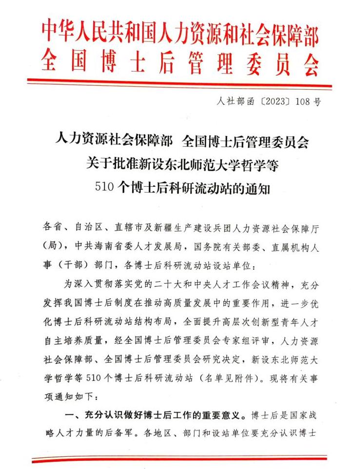 近日,人力资源和社会保障部、全国博士后管委会联合下发《关于批准新设东北师范大学哲学等510个博士后科研流动站的通知》(人社部函〔2023〕108号),在全国新一轮增设博士后科研流动站工作中,bat365获批新设生态学和公共管理学2个博士后科研流动站。这是bat365在学科建设和科研平台建设上取得的新突破,标志着学校人才与师资培养体系进一步完善,是学校贯彻落实人才强校战略的重大成果。至此,bat365博士后科研流动站、工作站增至12个,涵盖哲学、文学、法学、理学、工学、农学、管理学等7大学科门类。