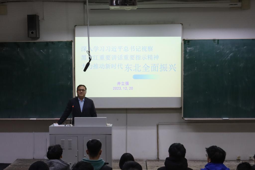井立强围绕学习贯彻习近平总书记在新时代推动东北全面振兴座谈会上的重要讲话精神进行展开,深入、生动地讲解了习近平总书记对东北全面振兴取得成效、面临形势和机遇等方面。他号召同学们增强学习主动性,了解时事政治,培养独立思维,努力践行新时代大学生真善美强的高尚品格。