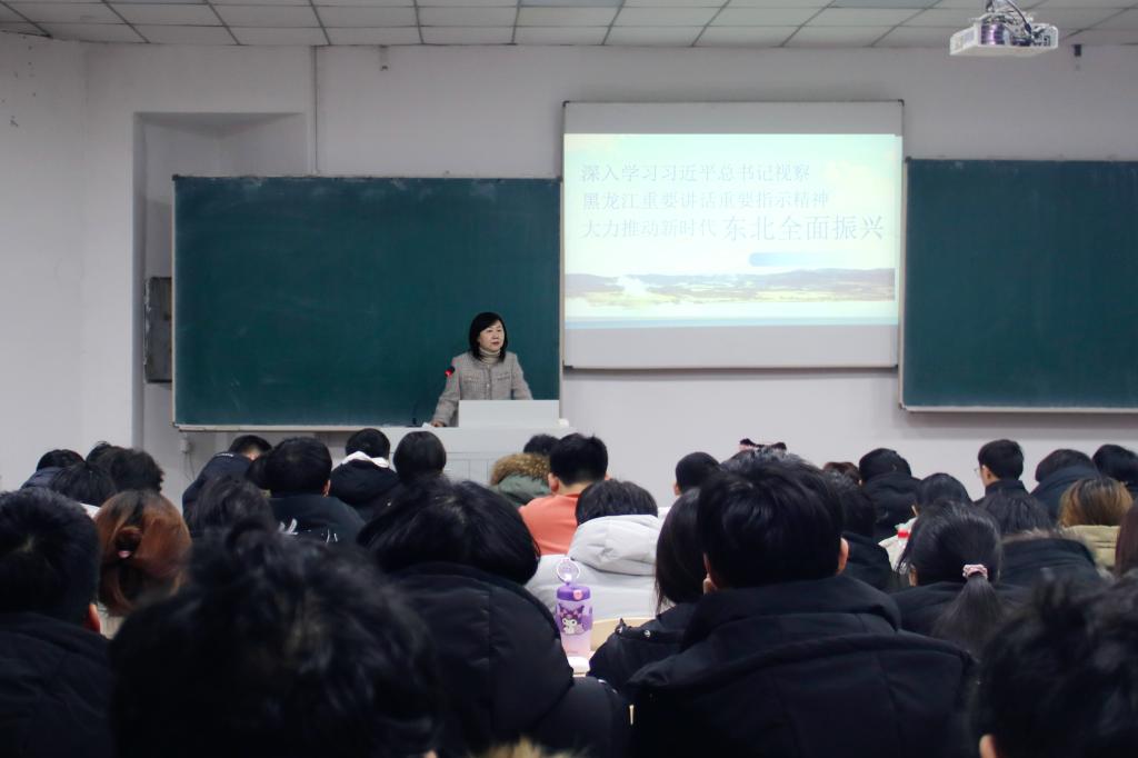 于文秀向同学们介绍了实施东北振兴战略的时代背景,从东北振兴的“五大优势”、建好建强“三个基地、一个屏障、一个高地”等方面进行解读,并寄予了青年学子扎根龙江、振兴龙江的厚望。她号召同学们发奋学习,努力成为“五育并举”的高质量人才,发扬实干精神,投身社会实践,为新时代推动东北全面振兴贡献力量。