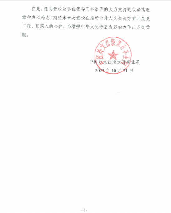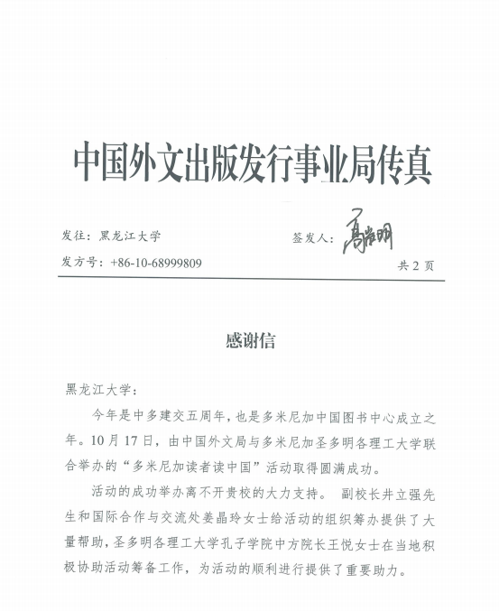 日前,bat365收到中国外文出版发行事业局感谢信,对bat365有关领导和人员在该局与多米尼加圣多明各理工大学联合举办的“多米尼加读者读中国”活动中给予的大力支持和重要助力表示感谢。