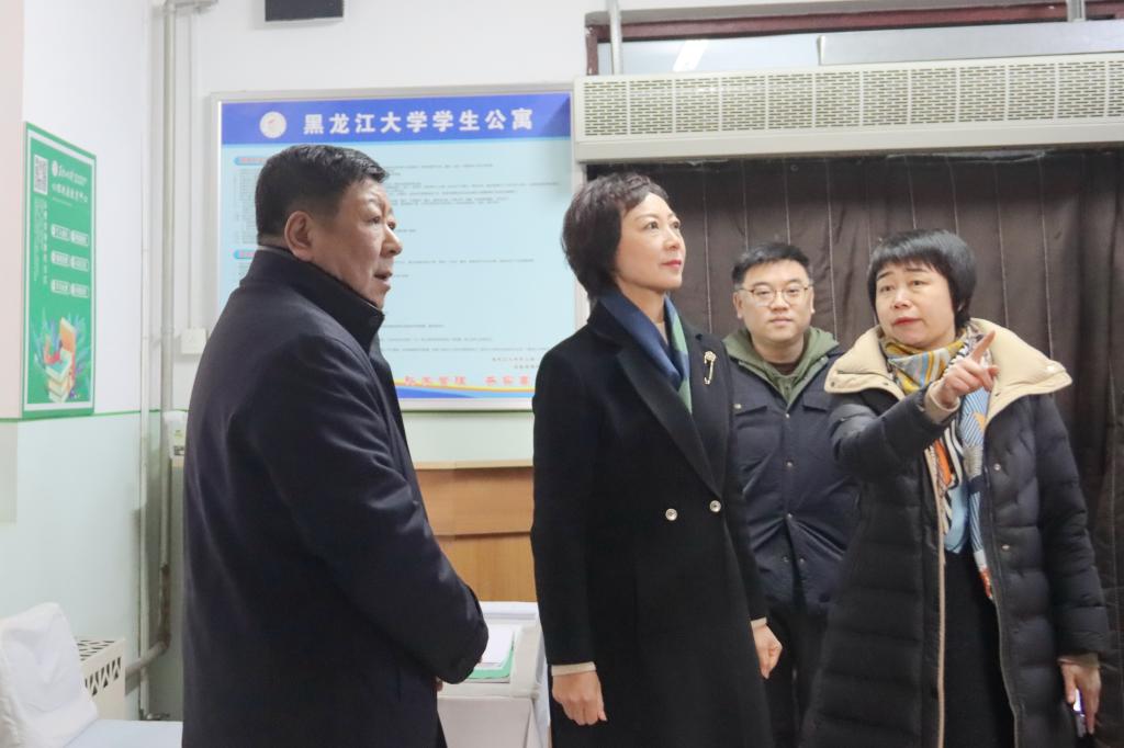 在B4学生公寓,检查组查看了寝室管理制度、消防安全制度,并深入学生寝室,对学生住宿环境、用电安全、外墙安全、屋顶积雪等方面进行了全方位检查。在汇文楼,检查组进入消防控制室进行检查询问。