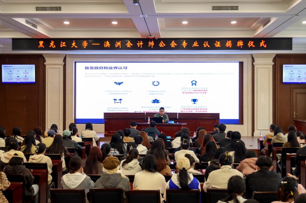 揭牌仪式后,为了让学生更深入的了解澳洲注册会计师以及做好个人职业规划,学院特邀曲大可先生以《成为澳洲注册会计师:以专业身份和国际网络成就个人事业》为题举行讲座。曲大可先生详细介绍了澳洲会计师公会的成立背景、行业地位、入会标准以及课程内容,并鼓励同学们提前规划自己的职业生涯并为此努力。