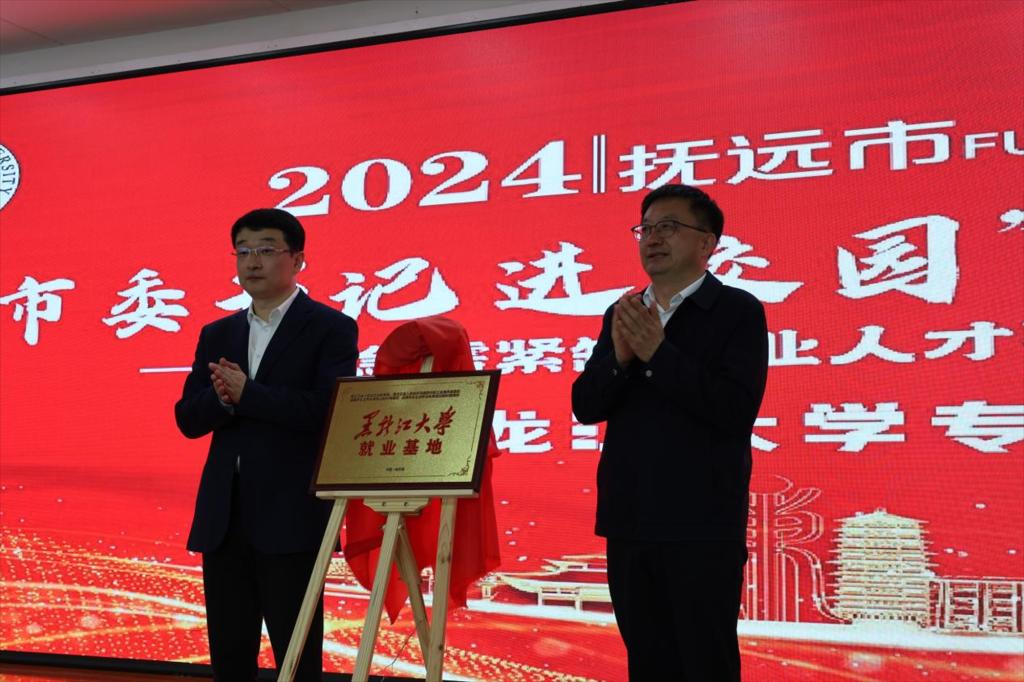 校党委副书记李君明与抚远市委书记何大海共同为就业基地揭牌。