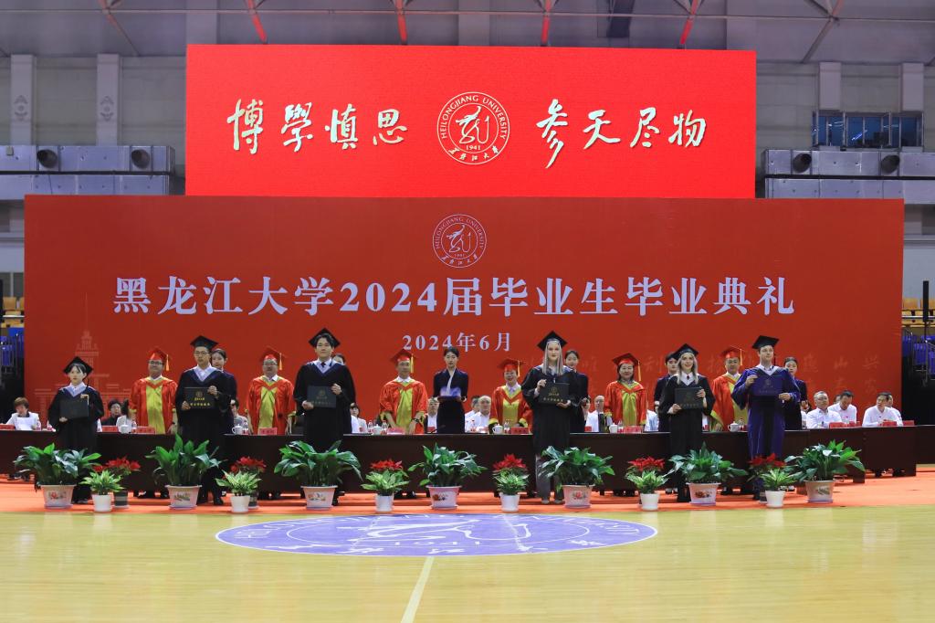 高级翻译学院2024届俄语口译硕士毕业生、俄罗斯籍学生林馨乐作为留学生毕业生代表发言。她讲述了在校期间学习和生活的点点滴滴。她说,是黑大给予了她勇气,让她勇于在人群面前展示自己,在迷茫时做出坚定的选择。她代表全体在华留学生表示,无论身处何时何地,将承担好国际文化交流的使命,讲好经历的中国故事,传播真实的中国声音。