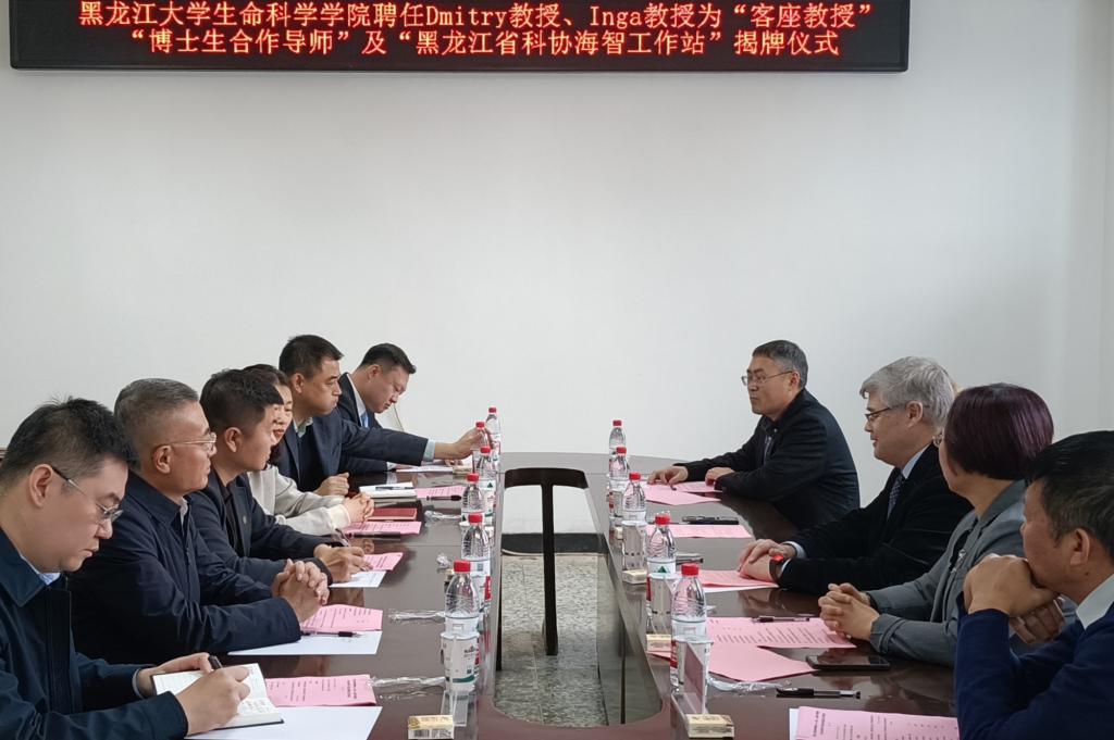 10月23日下午,在bat365生物楼315会议室举行俄罗斯科学院通讯院士、俄罗斯科学院西伯利亚分院、俄罗斯新西伯利亚国立大学自然科学系Dmitry Olegovich Zharkov教授,俄罗斯科学院西伯利亚分院、俄罗斯新西伯利亚国立大学自然科学系Inga Grin教授为“客座教授”“博士生合作导师”聘任仪式暨“黑龙江省科协海智工作站”揭牌仪式。副校长李卓、人事处、重点建设与发展工作处、科学技术处、研究生院、生命科学学院相关负责同志及教师代表出席该仪式。生命科学学院院长李海英主持仪式。