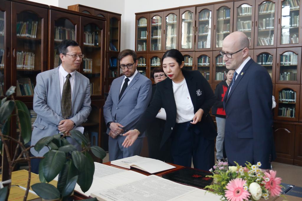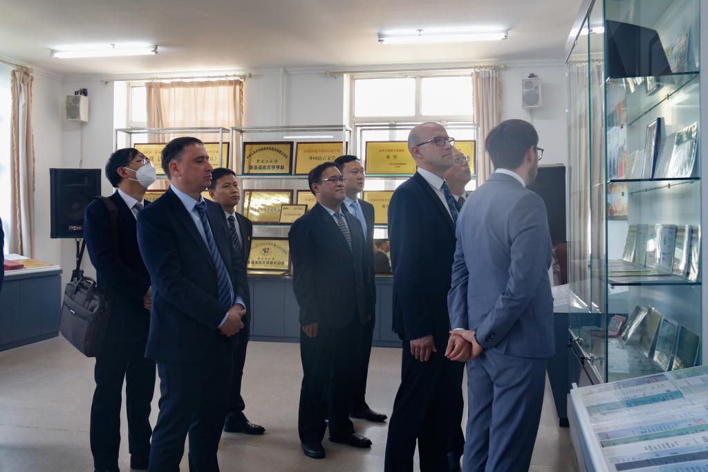 代表团一行参观了bat365俄语学科成果展、俄语学院资料中心。俄语学院院长孙超向代表团一行简要介绍了bat365俄语学院学科建设、学术成果、人才培养模式及校内俄语资料文献。