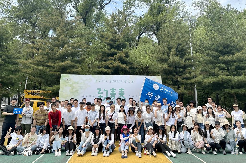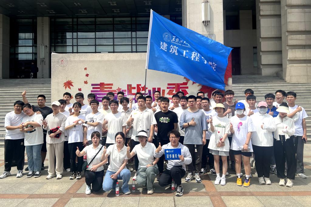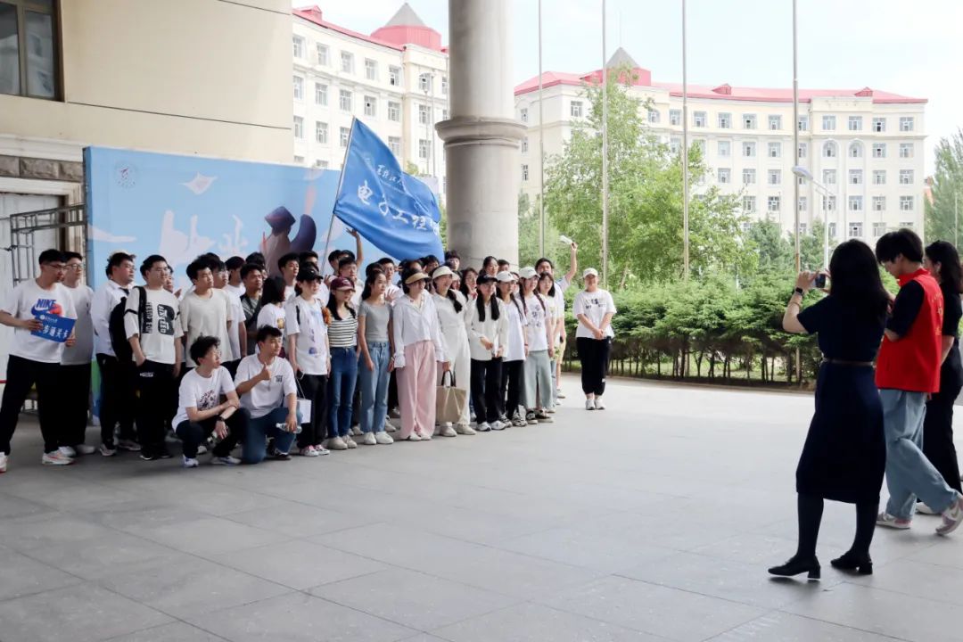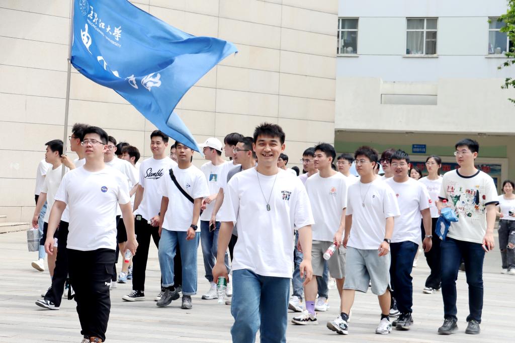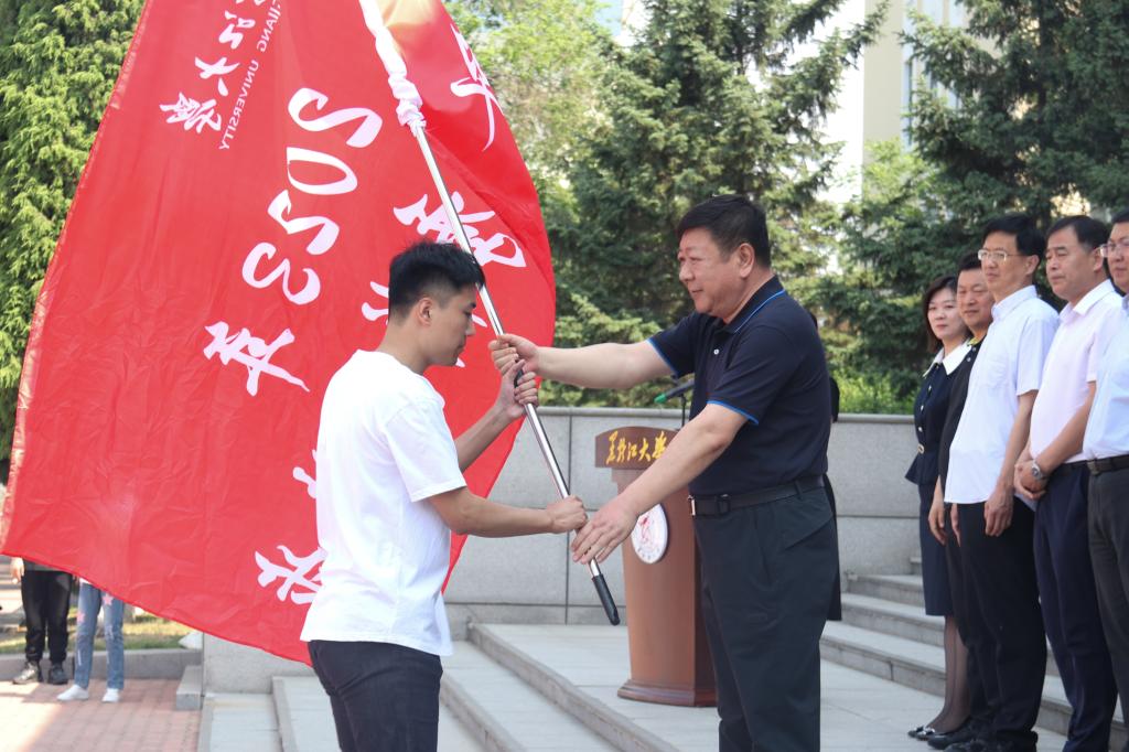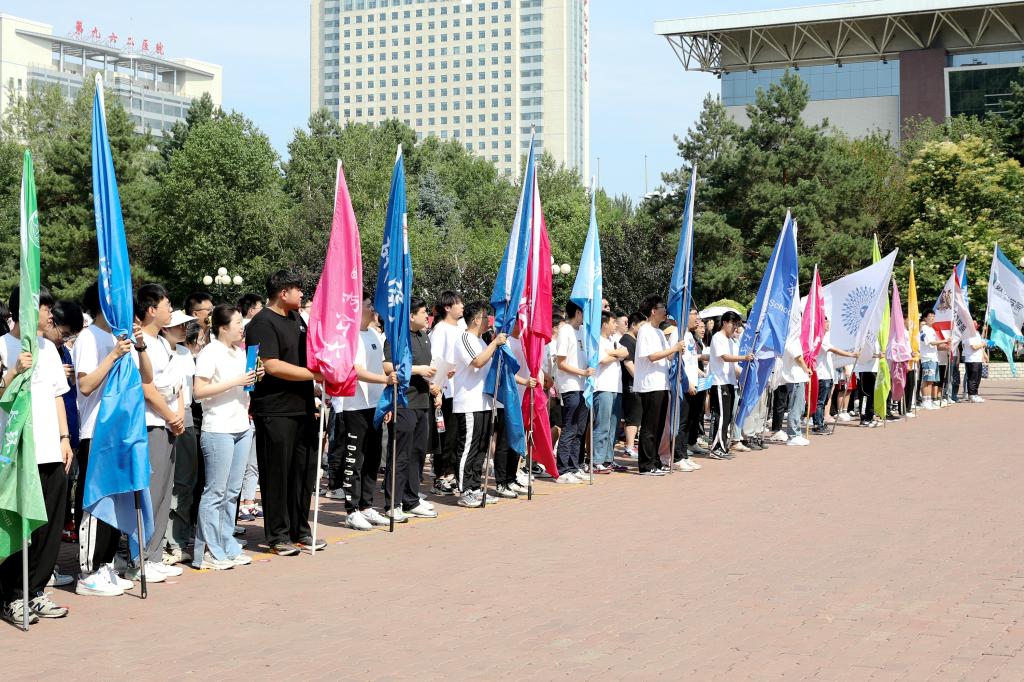王永清为本次活动授旗。黑龙江省2023届优秀毕业生获得者、电子工程学院毕业生党员郭润桐接旗。伴随高扬的旗帜,徒步枪响,活动正式开始,各学院辅导员、旗手、毕业生们以学院为单位依次出发。