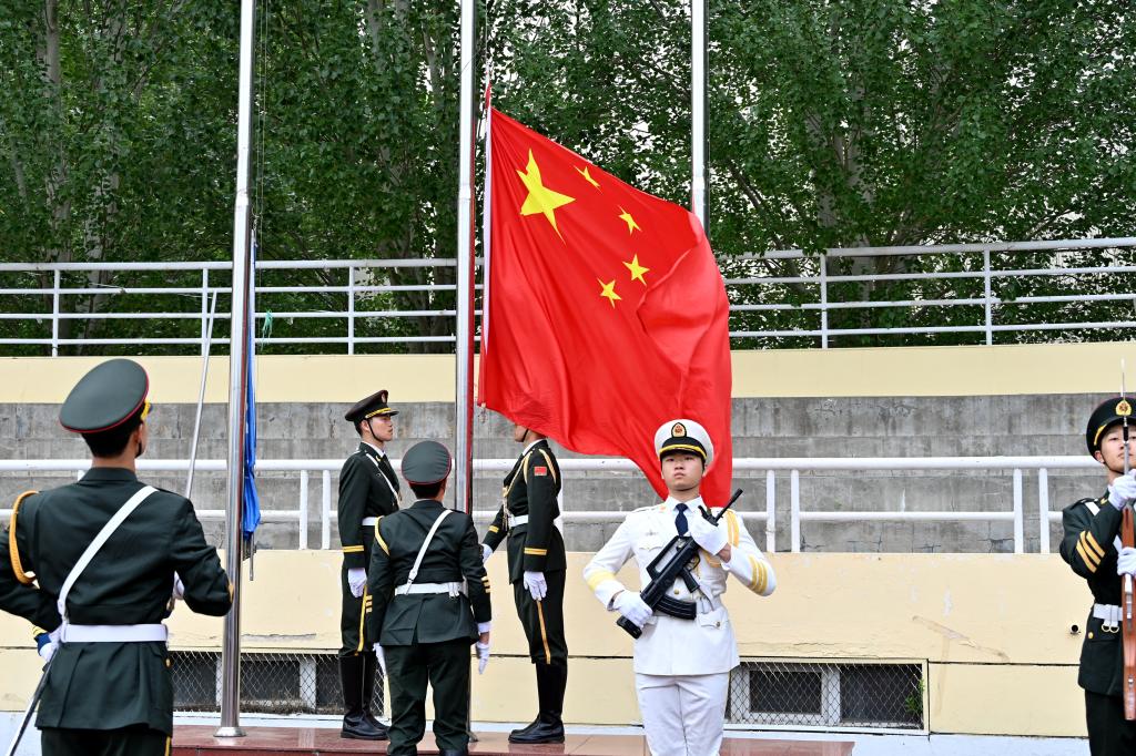 在雄壮的国歌和激扬的校歌声中,国旗、校旗冉冉升起。