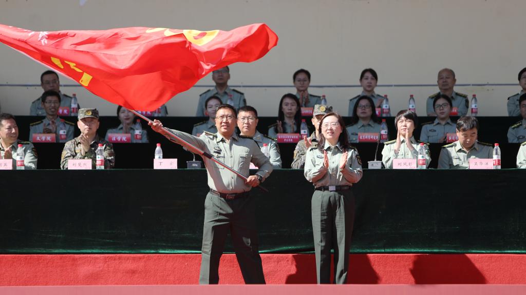 丁宏为学生连队授军旗,军训教官代表接旗。
